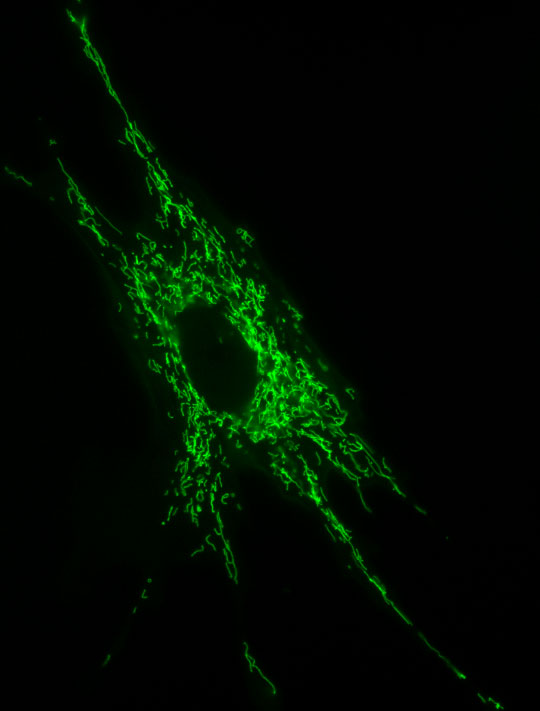 ミトコンドリア(右図)の研究には、現在第三の波が押し寄せています。1970年代の電子伝達系やクエン酸回路に関する研究、1990年代のアポトーシスやミトコンドリアDNAの研究に続く、2000年以降のミトコンドリア構成タンパク質の高次構造や、ミトコンドリアの動態(ダイナミクス)の研究です。このような領域の研究から様々な生理病態に関する予想外の知見や、斬新な創薬アイデアが提案されており、当研究室でもこのような流れのもと、ミトコンドリアの機能や動態に関わるいくつかの遺伝子に着目し、その詳細を網羅的かつ体系的に明らかにしようとしています。具体的には、1)脳や中枢神経系の発達(神経細胞やグリア細胞の分化・成熟)や機能維持におけるミトコンドリアの役割や、ミトコンドリア機能の破綻が精神疾患や神経発達症にどのように関与しているのかに関する研究、2)膵臓や脂肪、肺など末梢器官の発生や再生過程、あるいは組織のがん化におけるミトコンドリアの役割に関する研究を行っています。